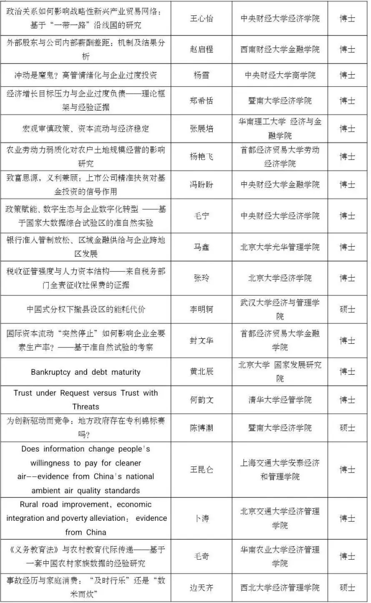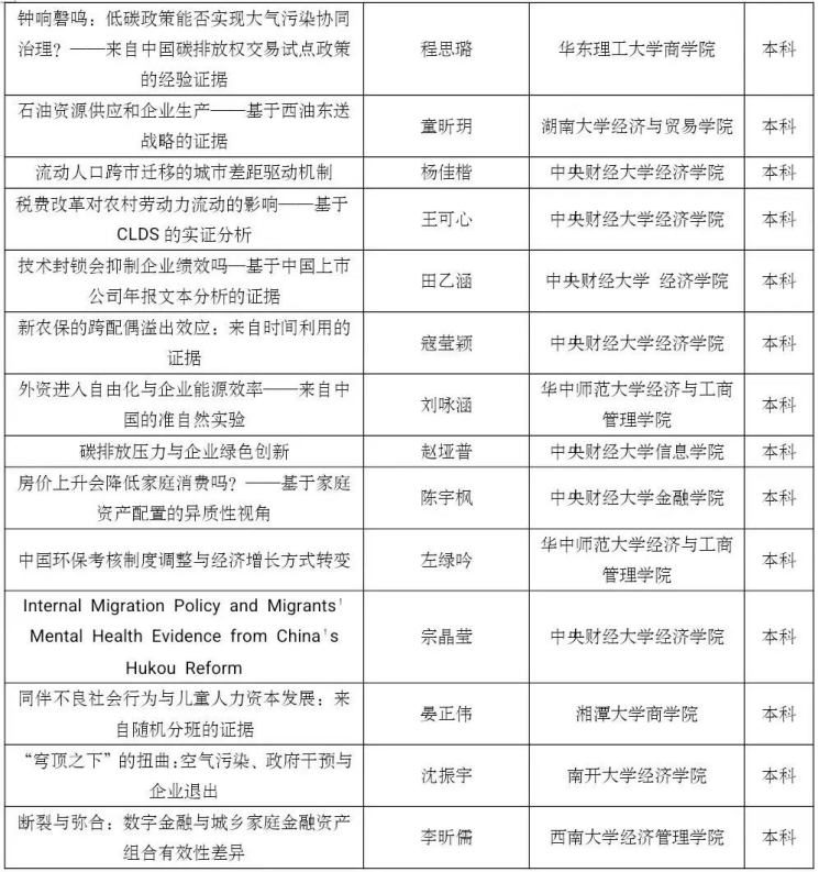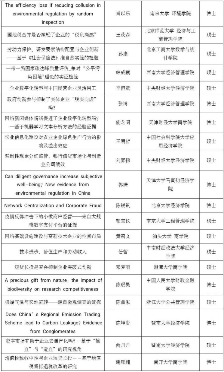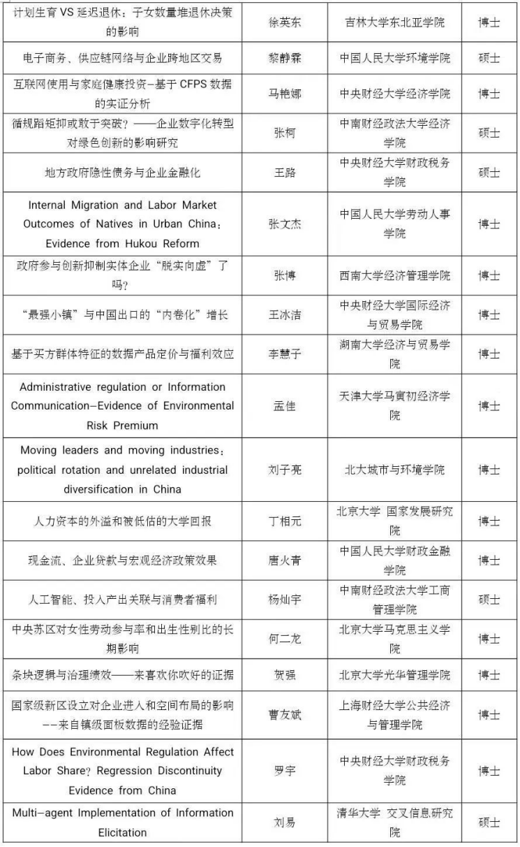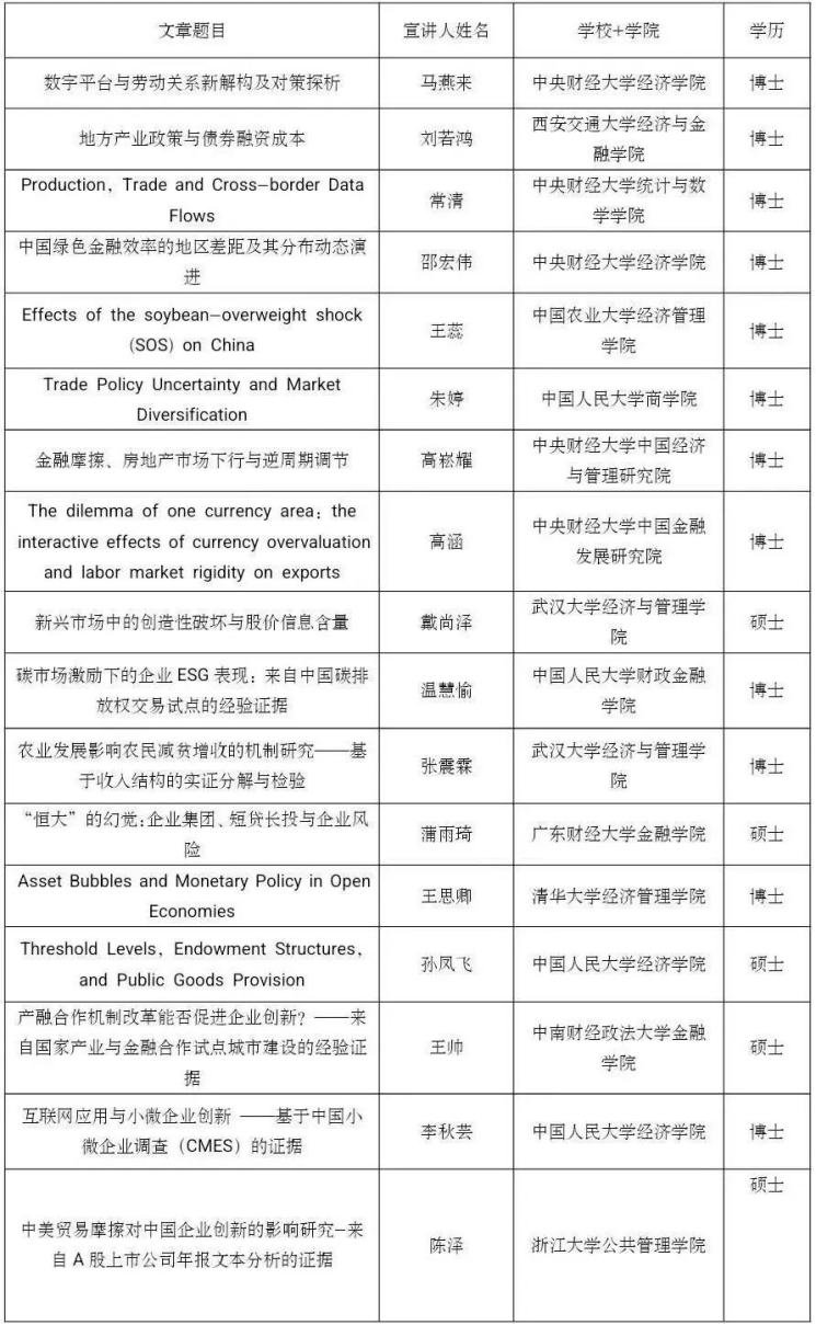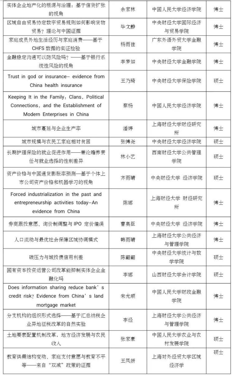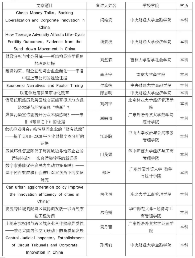 党的二十大报告指出,“教育、科技、人才是全面建设社会主义现代化国家的基础性、战略性支撑”。为了学习、贯彻和落实党的二十大关于教育和人才建设的精神,best365体育亚洲联合中国经济学年会、中国青年经济学家联谊会主办第五届未来经济学家论坛。本论坛坚持“公平、公正、公开”的原则,鼓励思想争鸣、学术创新,旨在为未来有志于从事经济学研究的全国高校在校员工(本科生和研究生)提供一个观点交流、思想碰撞的学术交流平台。本次论文征集环节共收到612篇投稿论文,经过评审论证和评审,最终遴选出126篇入围会议,名单如下,恭喜各位入选的同学: