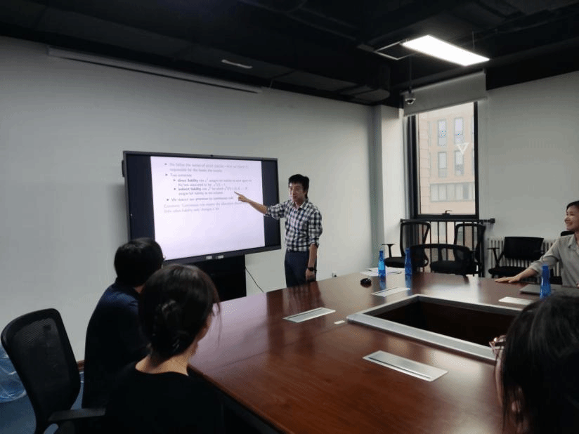 讲座伊始,高超禹老师用生动易懂的举例描述了本次讲座的主要问题:如何处理链式违约过程中的责任分配问题。高老师介绍,以往的研究通常都考虑单一责任人对不同受害者造成一系列违约引起的责任分配问题,对违约传递的责任分配研究较少。在此基础上,高超禹老师提出了一种智能合同体系,用以自动地确认各责任人的应担责任。