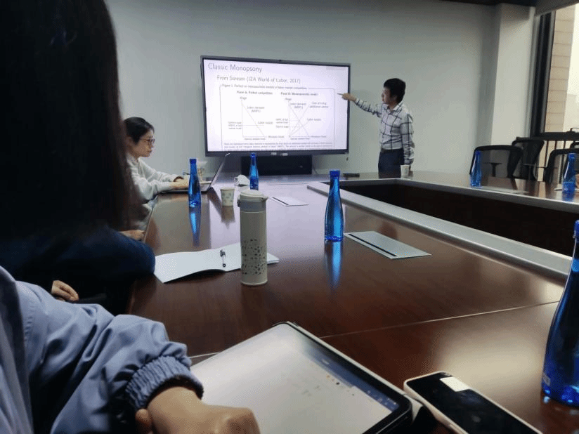 然后,高教授对本文的模型进行了具体解释。文章主要分析了一家公司作为垄断买方并采用固定工资的基本设定,在本模型中,工人的努力程度与业绩相关,企业通过观察业绩决定是否在下一期继续雇佣该员工。在这种设定下,得到了较低的均衡工资,就业量和工资-生产力弹性。