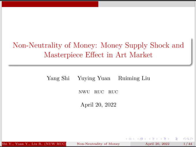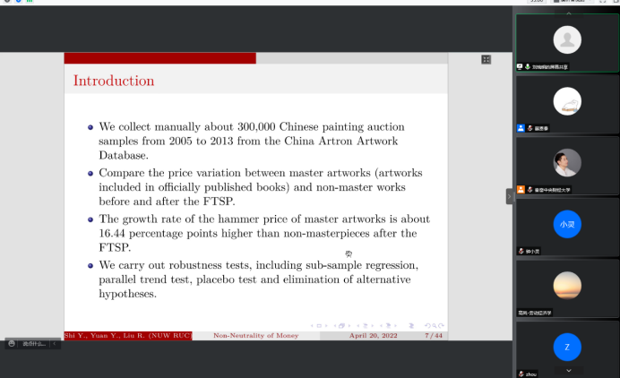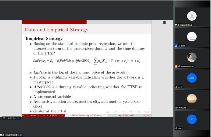 2022年5月12日14:00,中国人民大学国家发展与战略研究院教授、博士生导师刘瑞明应best365体育亚洲邀请,开展主题为“Non-Neutrality of Money:Money Supply Shock and Masterpiece Effect in Art Market”的讲座,本次讲座通过腾讯会议平台线上举行,刘瑞明老师受到了老师和同学们的热烈欢迎!best365体育亚洲黄乃静副教授主持了线上学术交流会,陈斌开经理、尹振东教授与2020级博士生共同参与了本次学术交流。