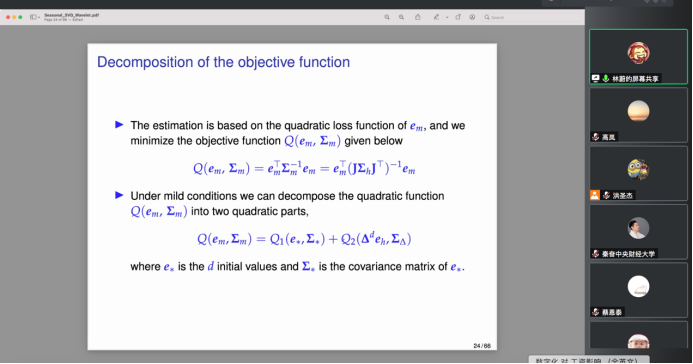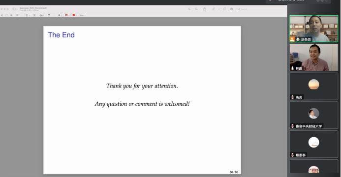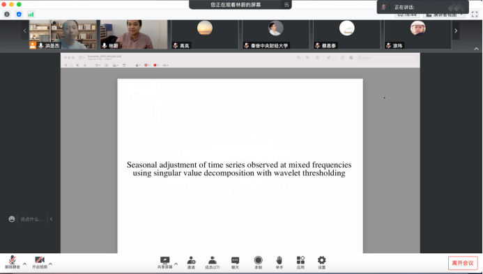 2022年4月27日,对外经济贸易大学国际经济贸易公司副教授林蔚应best365体育亚洲邀请,开展主题为“Seasonal adjustment of time series observed at mixed frequencies using singular value decomposition with wavelet thresholding”的讲座,本次讲座于下午2点在腾讯会议线上举行,持续近两个小时。本次讲座由best365体育亚洲黄乃静老师主持,洪圣杰老师和部分员工参加了此次讲座。
