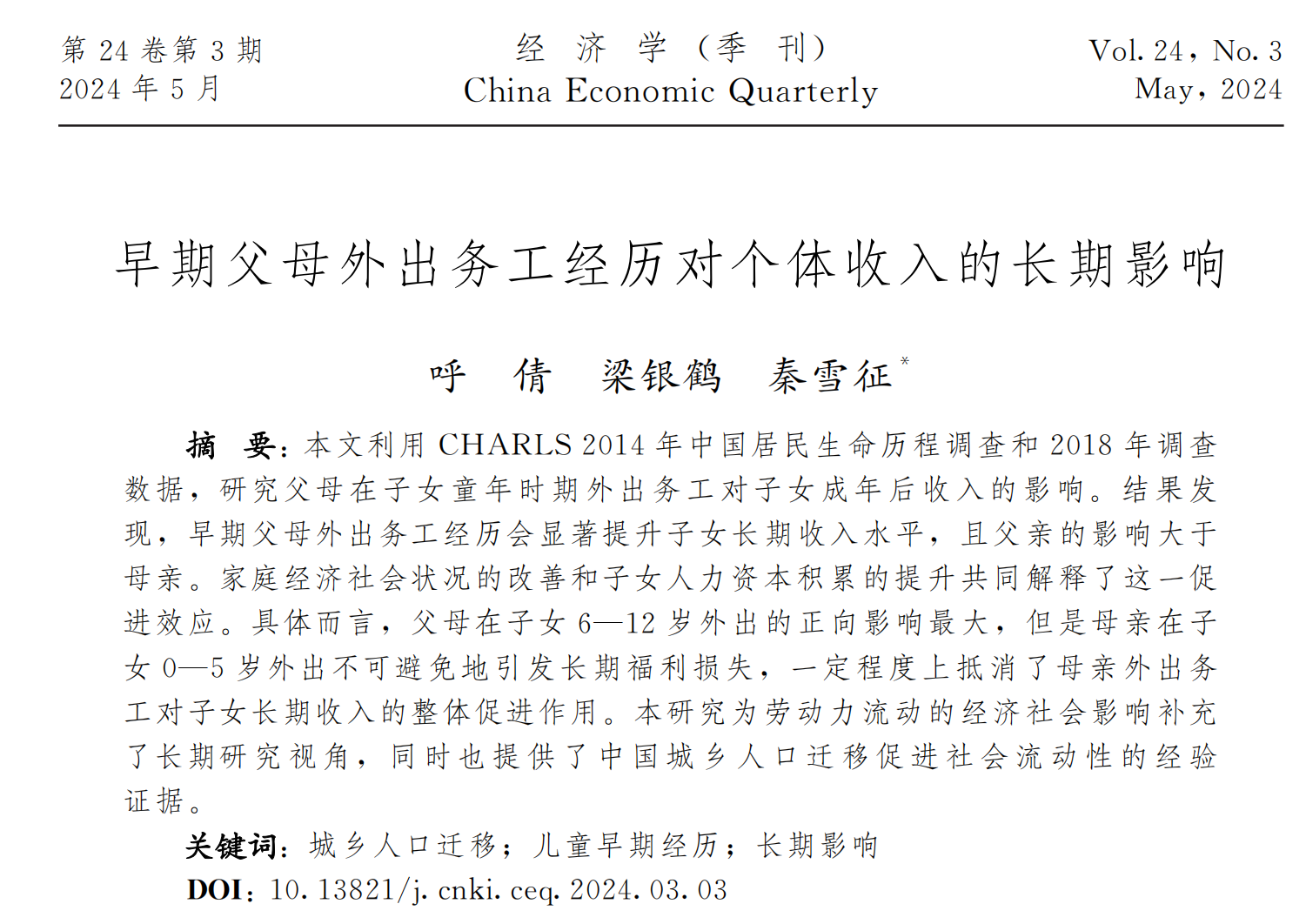 学术视点 | 公司梁银鹤老师的合作论文《早期父母外出务工经历对个体收入的长期影响》在《经济学(季刊)》刊发