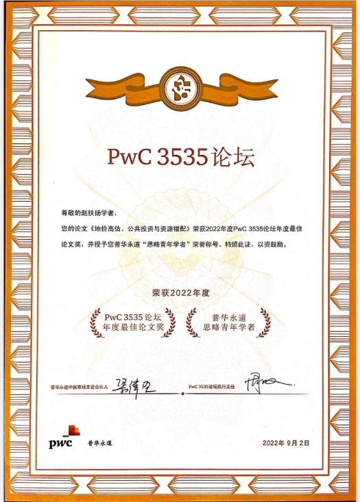 学术视点 | 公司赵扶扬老师获得普华永道中国第三届(2022)PwC 3535论坛年度最佳论文