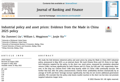 学术视点 | 公司夏俊杰老师论文《Industrial policy and asset prices: Evidence from the Made in China 2025 policy》被《Journal of Banking & Finance》刊发