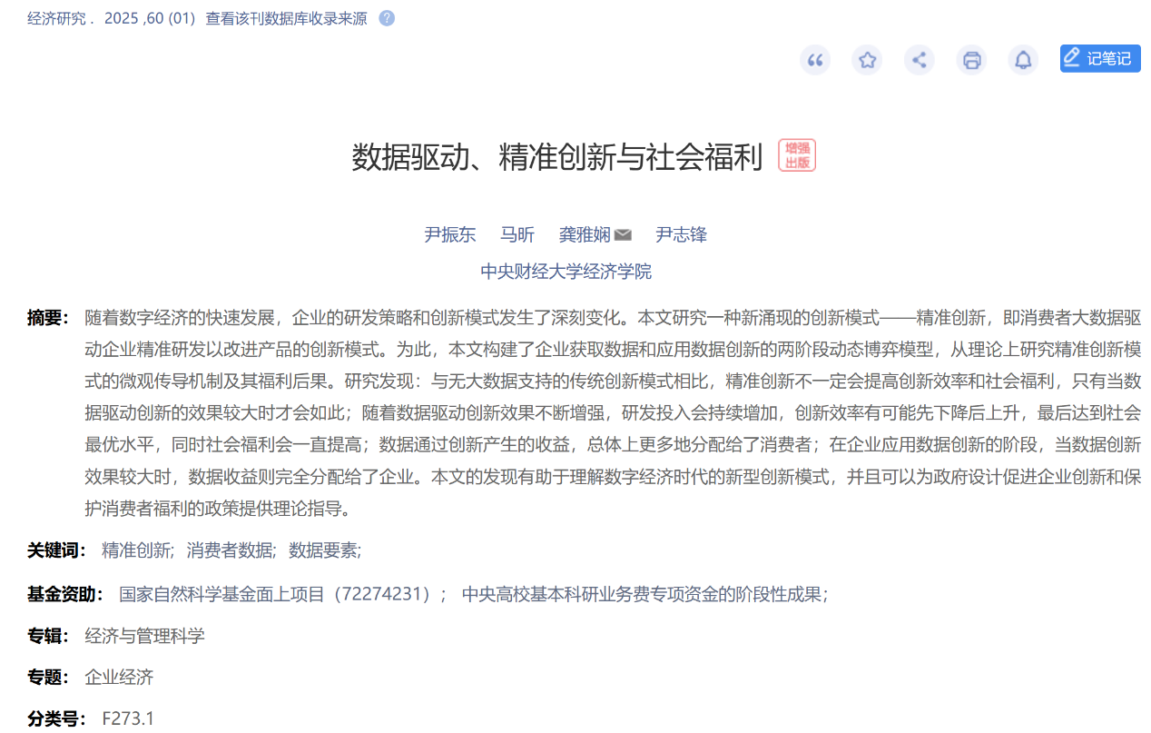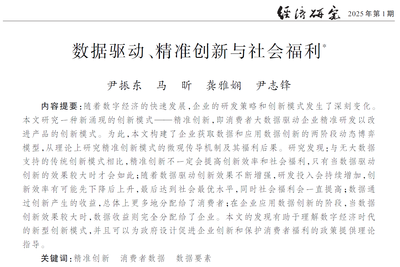 学术视点 | 公司老师的合作论文《数据驱动、精准创新与社会福利》在《经济研究》刊发