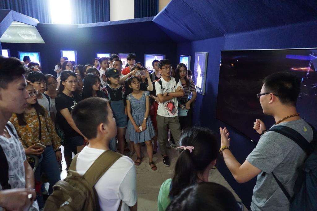 步入展厅,戴老师首先向大家强调了“同一个世界,同一片星空”的策展理念。丝绸之路是连接东西方经济、政治与文化的重要通道。星空则是人类宝贵的自然资源和文化的组成部分。不同文化背景的人,对星空会有着各自的解读,但丝绸之路上所有的人,无论古今,都共享这片星空。接下来,我们从中国嘉峪关上的北斗七星开始,顺着展廊的银河带,沿着陆上丝绸之路和海上丝绸之路,开启了一段奇妙的星空之旅。沿着丝绸之路的旅行,地面的景观在不断发生变换,但头顶的星空却是相同的。星空没有国界,星星平等地闪耀在每个国家之上;星空之下,人类共有一个家园,合作才能共赢共享——对于暗夜星空保护和星空探索如是,对于世界经济发展亦如是。古丝绸之路跨越了东西方文明,将不同文明、宗教、种族联系在一起,基于求同存异、开放包容的精神,创造了共同繁荣。今天,为了应对当前经济增长乏力、发展鸿沟突出、风险日益增加等世界局势,中国提出了“一带一路”的解决之道。