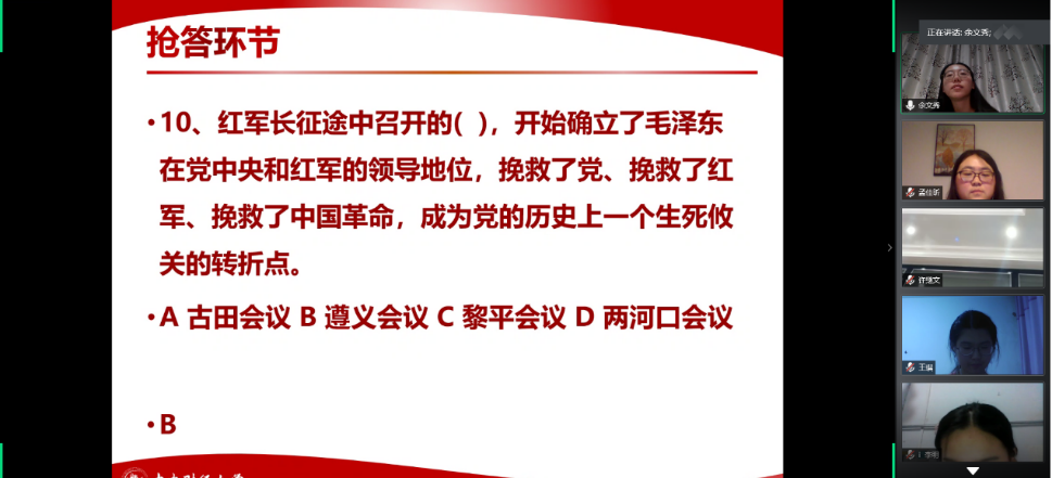 为庆祝中国共产党成立99周年、迎接七一建党节,2020年6月29日晚上,best365体育亚洲2018级硕士生第二党支部开展“初心不忘、献礼七一”线上主题活动。本次活动分为主题党课、红色经典配音比赛和党史知识竞答三个环节,旨在回顾中国共产党建党历程、追溯党和国家砥砺奋进之路、牢记共产党人的初心使命。本次活动由党支部书记余文秀主持,党支部全体党员、预备党员和发展对象参与了此次活动。