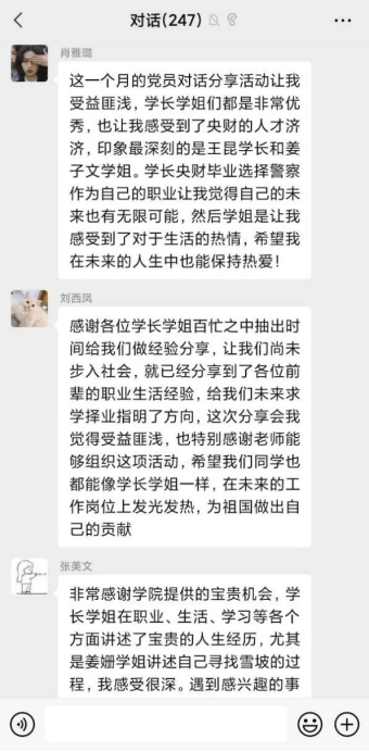 经济公司党委特邀请了李响、朱炬兵、孙建华、姜姗、张川石、姜子文、张银、王昆、王朝阳、田燕刚等十位工作在各行各业的基层党员员工和嘉宾。针对调研中收集到的同学们求学阶段最关注的包括学业规划、人际关系、求职就业、职业发展、亲子沟通等五个大类共计51个问题,员工们与大家展开线上分享与交流,讲述他们成长与奋斗的心路历程,以个人经历的“小四史”反映国家发展的“大四史”,以历经思考的亲身经历与感受,引导对人生和前途心怀疑惑的学弟学妹摆脱焦虑困扰,启发大家探索自己内心世界,启迪同学们全面辩证认识所处的时代,展现了真实、立体的中财人青春奋斗图景。经济公司党委书记郭冬梅老师鼓励大家学史明理、学史增信、学史崇德、学史力行,与时代同步伐、与人民共命运,切实做到不忘初心、脚踏实地、忠诚奋进!