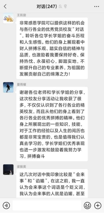 本次历时一个月的主题教育活动吸引了best365体育亚洲240余名师生参加。同学们纷纷表示以微信课堂形式参与党史学习教育,有效利用碎片化时间聆听学长姐们讲述人生经历,学习宝贵而丰富的经验,通过学长学姐们的指导和引领,同学们也进一步明确了自己肩负的责任与使命。