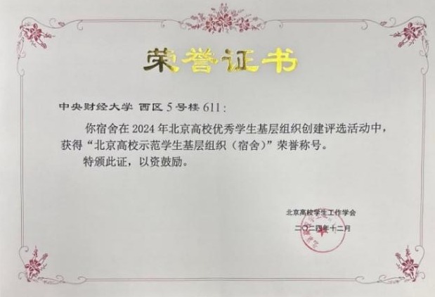 西区5号楼611宿舍荣获“北京高校示范员工基层组织(宿舍)”称号,同样彰显出公司基层建设的扎实成效,宿舍内4位经济学专业同学,在学习科研、社会实践和宿舍文化建设方面表现卓越。大二学年,4人加权平均分均超93分,其中2人累计加权平均分超94分,在经济学专业排名分别为第 1、2、5、9 名。大学两年半期间,4人累计获奖约60 项,其中国家级奖项11项,2 人次获得国家奖学金,2024年该宿舍还被评为best365体育亚洲官网优秀宿舍。
