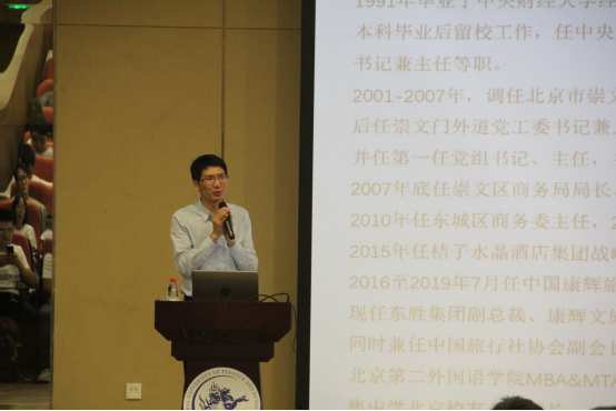 在同学们满心的期待和热烈的掌声中,首先由陈斌开经理隆重介绍孟志军员工。孟志军员工现任东胜集团副总裁、康辉文旅产业集团联席董事长,同时兼任中国旅行社协会副会长,中国步行商业街工作委员会及中国商旅文化产业联盟专家委员,中国商业学会理事等。
