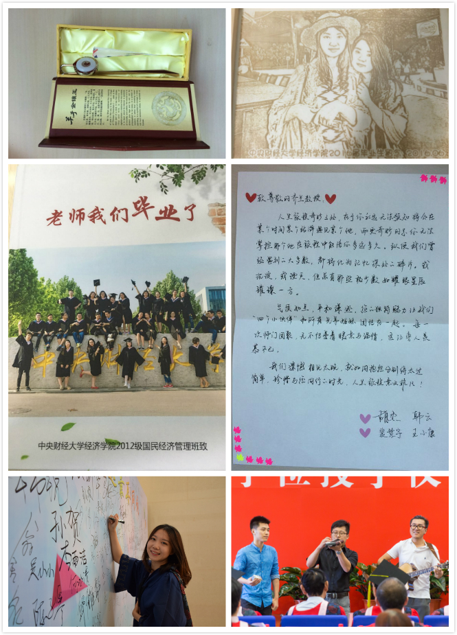 毕业的喜悦掺杂着离别的忧伤,对往日时光的回忆与对未来生活的期盼是毕业生最真的情感。经济学12级本科生以“青春之歌”为题,用朗诵来告别“爱人们”,“在最急最美的时光里,我们的遇见却是如此美丽”;国民经济管理12级本科生以日记的片断回顾他们光阴的故事,“2012年9月1日,晴,开始了老员工活……2016年6月24日晴,我们毕业了”,为老师献上自制的《青春纪念册》,再一次唱起“我们虽然人不算多”的班歌……。2014级硕士毕业生则在相互赠送的书签里留下了彼此间最真诚的祝福,同时为老师呈上了“私人订制”感恩答谢贺卡。毕业时刻,感念师恩,每个毕业班都用自己的表达方式阐述了“经院予我,时光予你”的特殊意义。之后,在93名硕士毕业生的倡议下,公司2016届202名本硕博毕业生面向恩师、面向亲友、面向自己郑重承诺,庄严宣誓“谨遵师长教诲,弘扬经院精神,格物明德,不事空谈,惟新前行,拼搏敢当,无论身居何处,心怀光明,坚守信仰,无论贵贱贫富,立己达人,经世济民”。