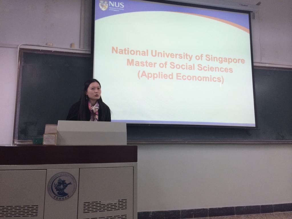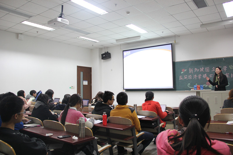 宣讲会上,韦青老师首先向同学们介绍了新加坡的风土人情、区位条件。与欧美相比,新加坡无疑是更具亲和力的留学地点。随后,韦老师谈到了新加坡的高校建设情况。新加坡国立大学共由16个公司组成,应用经济学硕士项目隶属于人文与社会科学公司的经济系。作为新加坡高级人才的培养中心,NUS每年获得政府经费2.5亿新元,在政府的大力支持下,新加坡国立大学迅速发展。之后韦青老师从项目方向、课程设置、录取条件、留学费用、毕业去向等方面对应用经济学硕士项目做了详细的说明。国大经济系的应用经济学项目已有20多年的历史,目前班级公邮77名来自新加坡、中国、印度及世界各地的员工。该项目以应用经济学为主,主要课程涉及微观经济学、宏观经济学、计量经济学、金融学等经济、金融相关领域,员工可以在读书的同时去企业进行充分的自我完善和锻炼,本项目的毕业生分布在新加坡国内外的银行、金融服务、科研教学、投资咨询等行业,为新加坡经济发展做出卓越贡献。