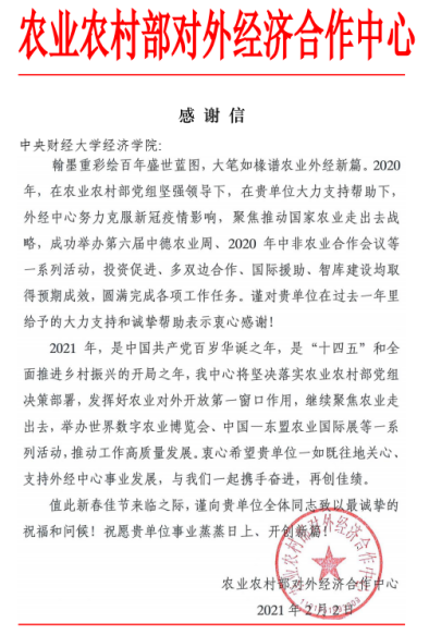 新春伊始,best365体育亚洲收到来自农业农村部对外经济合作中心的感谢信,对公司涉农团队完成中心委托的各项任务高度认可,并向公司全体师生致以祝福和问候。