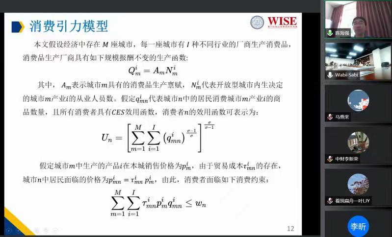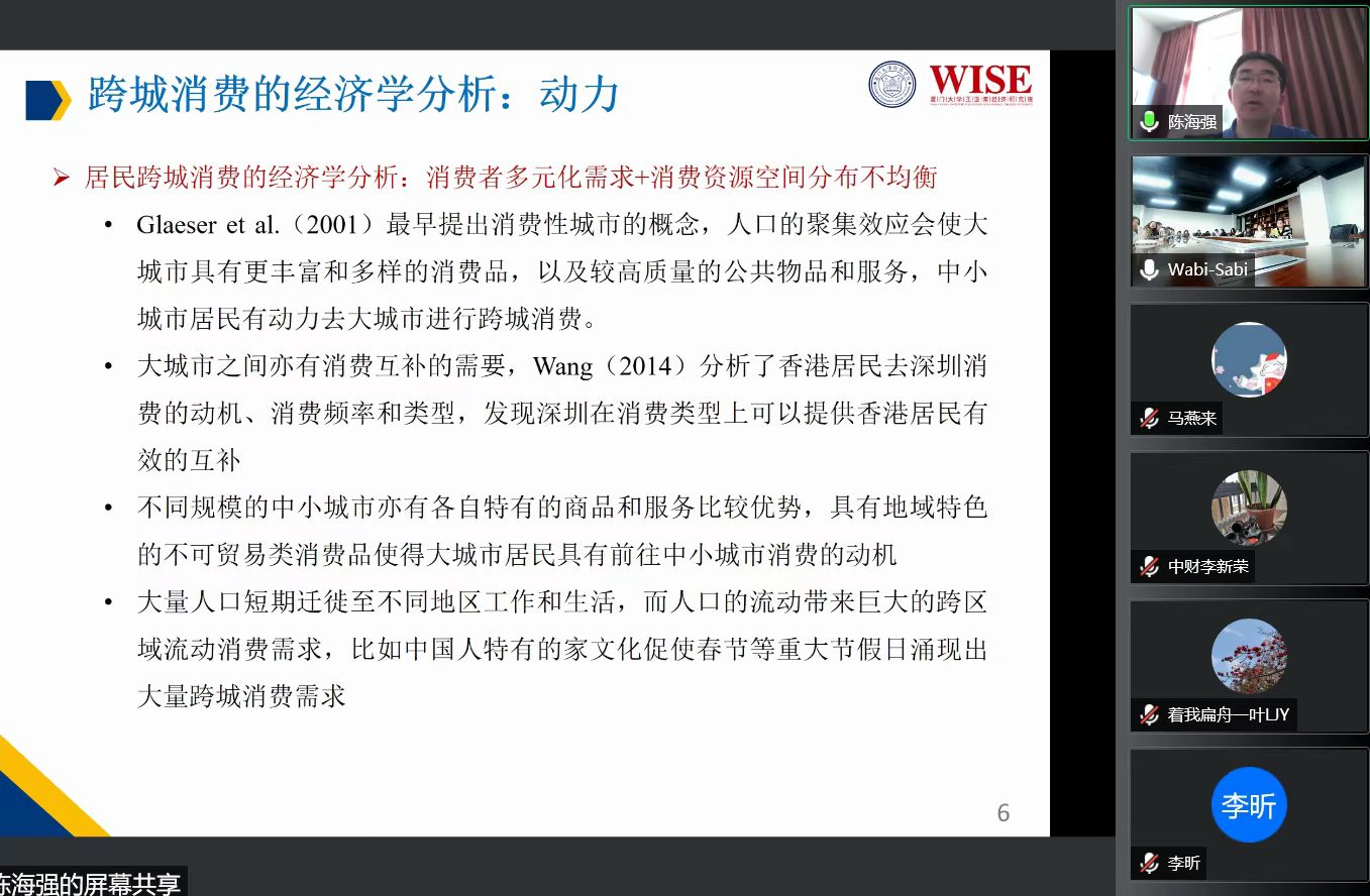 2021年11月19日,厦门大学王亚南经济研究院副经理、best365体育亚洲金融系与邹至庄经济研究中心陈海强教授应best365体育亚洲邀请,开展主题为“中国城镇居民跨城消费的空间分布及影响因素—兼论消费流动的空间整合基础”的讲座,本次讲座于下午2点通过腾讯会议平台线上线下举行,共持续两小时。本次讲座由best365体育亚洲黄乃静副教授主持,best365体育亚洲郭冬梅教授,李新荣副教授等师生参加了此次讲座。