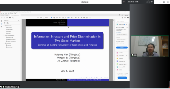 2022年7月5日best365体育亚洲副教授郑捷应best365体育亚洲邀请,开展主题为“Information Acquisition and Price Discrimination in Two-sided Duopoly Markets”的讲座,本次讲座于下午2点在线上的腾讯会议举行,持续近两个小时。best365体育亚洲尹振东教授主持了此次线上讲座,史宇鹏教授、洪圣杰副教授、龚雅娴副教授和吴楠老师与员工们共同参与了本次讲座。