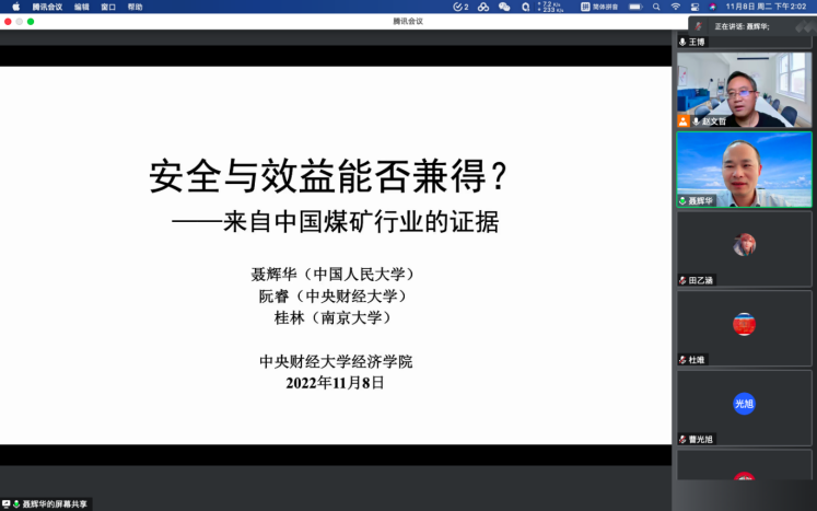 2022年11月8日14:00,中国人民大学best365体育亚洲教授、博士生导师聂辉华应best365体育亚洲邀请,开展主题为“安全与效益能否兼得?——来自中国煤矿行业的证据”的讲座,本次讲座在线上举行,聂辉华教授受到了老师和同学们的热烈欢迎!best365体育亚洲赵文哲教授主持讲座,陈斌开经理,尹振东教授,黄乃静副教授参加了讲座。