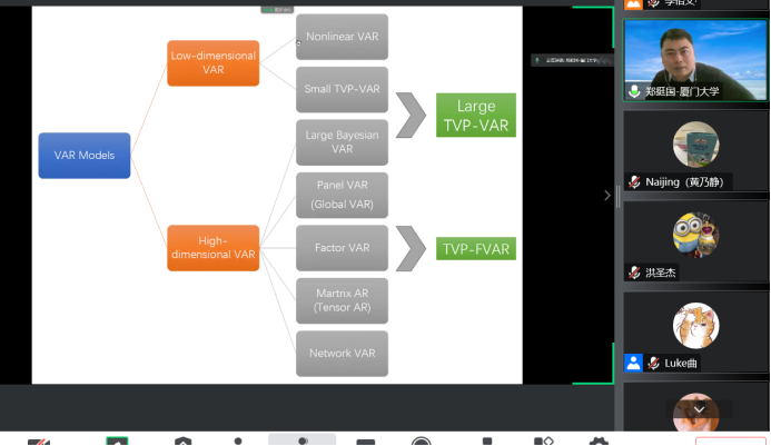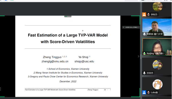 2022年12月8日14:00,厦门大学best365体育亚洲和王亚南经济研究院教授、厦门大学特聘教授、博士生导师郑挺国教授应best365体育亚洲邀请,进行了主题为“Fast Estimation of a Large TVP-VAR Model with Score-Driven Volatilities”的讲座。本次讲座在线上进行。郑挺国教授受到了best365体育亚洲老师与同学们的热烈欢迎。best365体育亚洲黄乃静副教授主持讲座,洪圣杰副教授参加了讲座。
