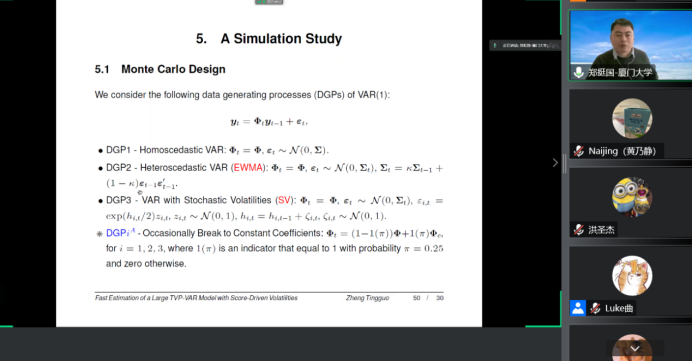 基于得分驱动建模框架,郑教授系统阐述了模型构建、初始设定、公式推导的过程,郑教授首先假设TVP-SVAR各方程中结构误差的时变方差是得分驱动的,然后提出了估计时变参数和时变波动率的滤波和平滑方法。