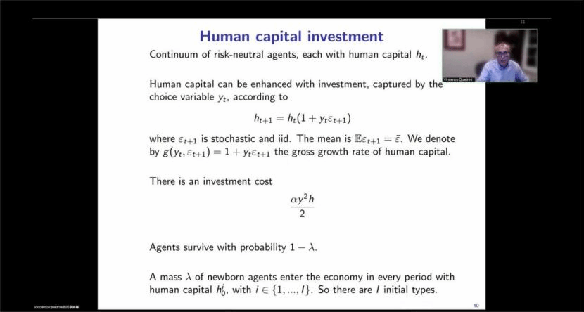 Quadrini教授阐述了收入分配在宏观经济学中的重要地位。在本次研讨会上,Quadrini教授探讨了在收入的外生过程中,财富的分配的确定方式。他通过内生决定模型,研究人力资本投资的模型,以研究为什么不同人的劳动收入不同。在这里,收入不平等不再被看作是一个纯粹的随机过程,而是看作是不同机制作用的结果,如人力资本投资(例如教育)或某些技能的相对需求较高(影响某些技能相对于其他技能的价格)等。最后,Quadrini教授还阐述职业选择如何决定劳动收入。