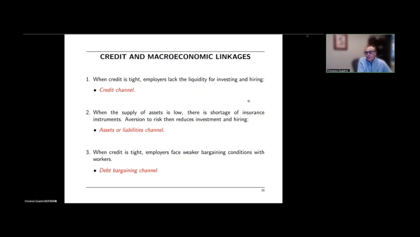 在本次研讨会上,Quadrini教授首先强调了金融发展在现代经济中起着至关重要的作用。就金融机构而言,银行和股票市场将资金从储蓄者引向生产性企业(借款者),同时管理经济风险和流动性。