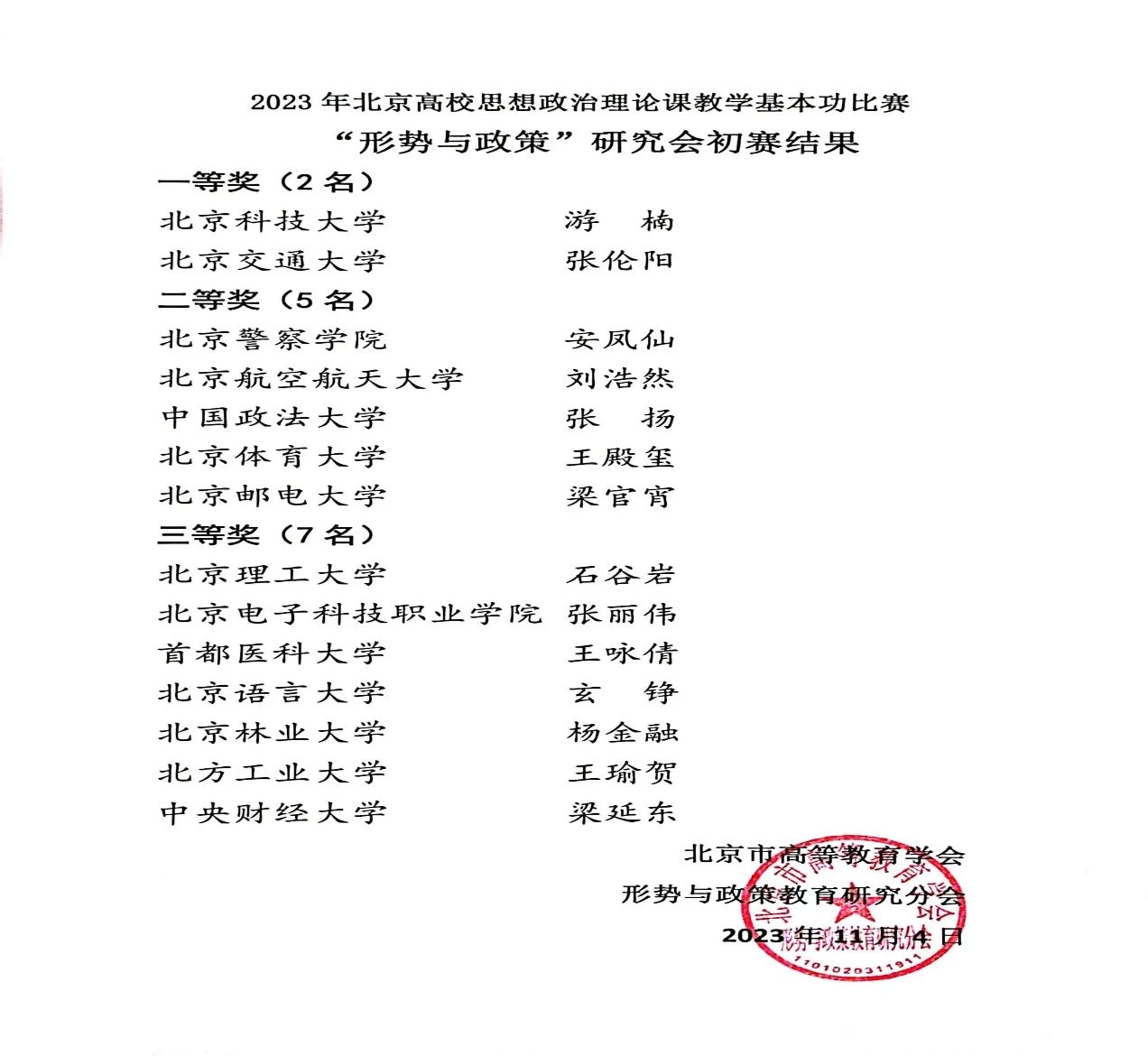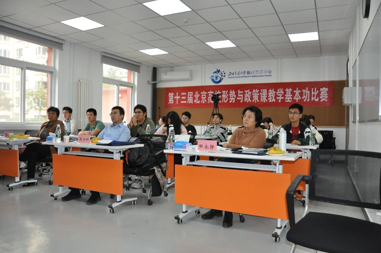 本次比赛由北京市高等教育学会形势与政策教育研究分会主办,北京交通大学马克思主义公司承办。来自北京大学、北京航空航天大学、北京理工大学、北京邮电大学、中国政法大学、best365体育亚洲官网、对外经济贸易大学、北京科技大学、北京林业大学、北京化工大学、北京交通大学等24所在京高校的“形势与政策”课教师参加了比赛。比赛以推动党的二十大精神融入思政课教学为主题,重点考察思政课教师学深悟透党的二十大精神,并将其融入课堂教学的理论水平,特别是立足京华大地生动实践讲好“大思政课”的能力。