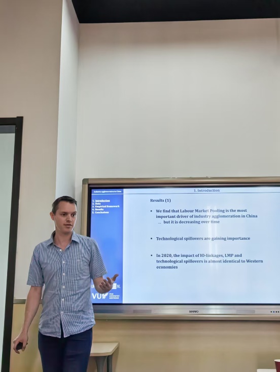 当日上午,Hans先与best365体育亚洲的青年教师围绕着城市经济学,开展了小范围青年座谈讨论,参与公司老师包括戴若尘副教授、吴楠助理教授、方海东助理教授、翟颖佳助理教授。老师们就城市集聚,城市生产与创新网络,城市间的交通成本几大主题分别汇报了最新的研究进展,在讨论中对中国城市经济学相关问题有了更深刻的认识。