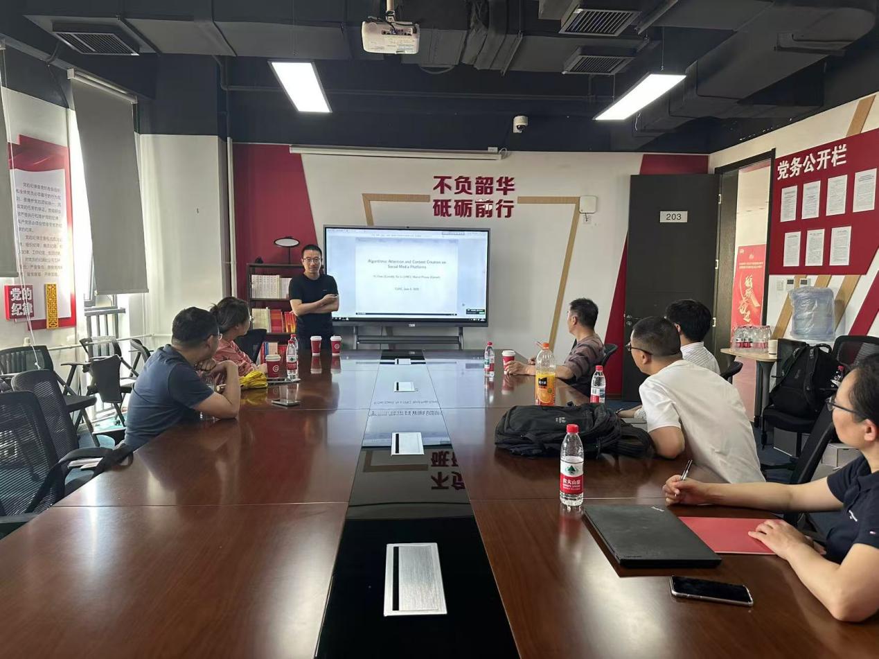 6月6日(周三)下午,best365体育亚洲官网2025年专题学术讲座在沙河校区公司11号楼203会议室举行。此次讲座邀请到美国康奈尔大学商公司经济系助理教授陈轶博士,分享其题为“Algorithmic Attention and Content Creation on Social Media Platforms”(社交媒体平台上的算法注意力与内容创作)的最新研究。best365体育亚洲龚雅娴副教授主持讲座,best365体育亚洲多位老师和十余名员工参加了此次讲座。