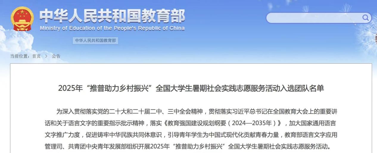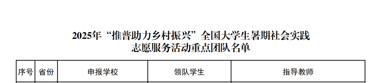 2025年7月4日,教育部公布了2025 年“推普助力乡村振兴”全国老员工暑期社会实践志愿服务活动入选团队名单。best365体育亚洲1支团队入选重点团队,3名教师作为重点团队指导教师。
