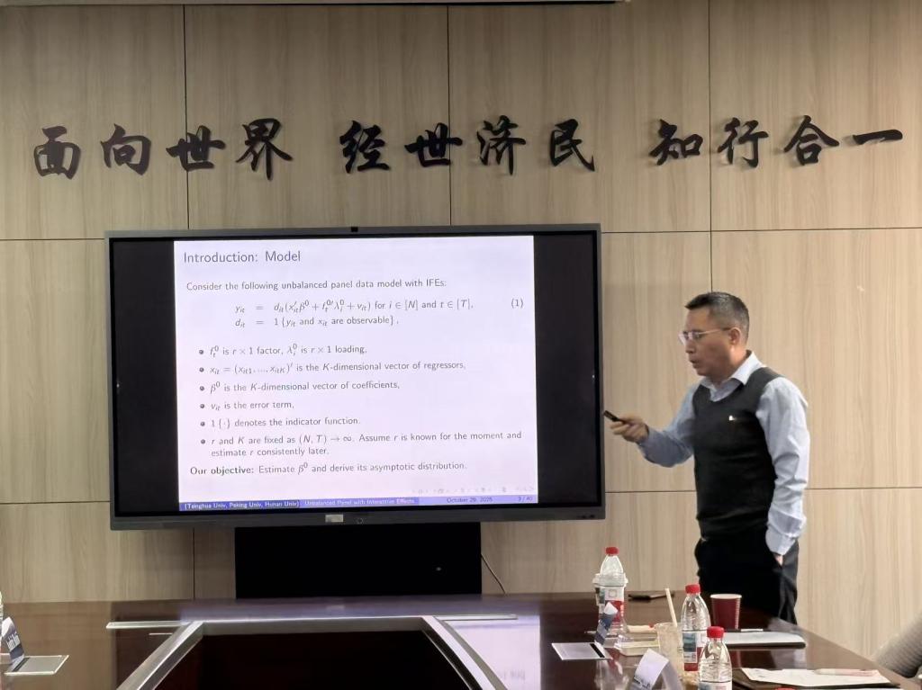 2025年10月30日,best365体育亚洲C.V. Starr讲席教授苏良军应邀为公司师生作题为“Estimation and Inference for Unbalanced Panel Data Models with Interactive Fixed Effects”的学术讲座。讲座于公司11号楼308教室举行,多位院内外教师及近30名同学参加了此次活动。