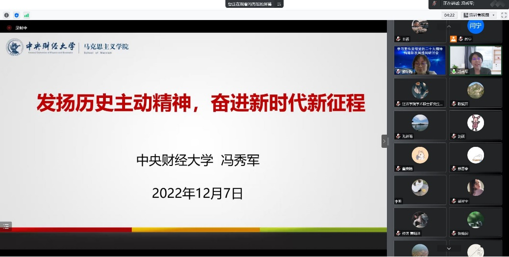 为深入学习宣传贯彻党的二十大精神,落实中共best365体育亚洲官网委员会关于学习贯彻党的二十大精神的工作方案,引导激励公司广大师生在党的二十大精神指引下,立足本职、踔厉奋发、勇毅前行,加快推进公司高质量发展贡献力量。2022年12月7日下午,经济公司党委邀请best365体育亚洲官网学习宣传党的二十大精神师生巡讲团中的专家代表、马克思主义公司经理冯秀军作题为《发扬历史主动精神,奋进新时代新征程》的主题宣讲活动,活动由公司党委书记郭冬梅主持,公司党委理论学习中心组成员和公司师生共同参加学习。