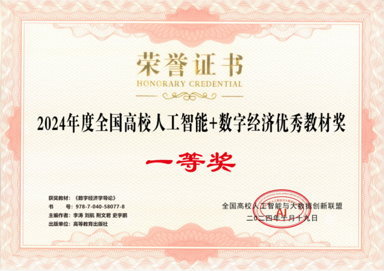 公司李涛老师和互联网经济研究院刘航老师担任主编的《数字经济学导论》荣获了2024年度全国高校人工智能与数字经济领域优秀教材一等奖。作为《新文科·数字经济系列教材》中的首部教材,该教材于2022年7月由高等教育出版社正式发行,并至今已累计印刷六次,总印数超过一万册。