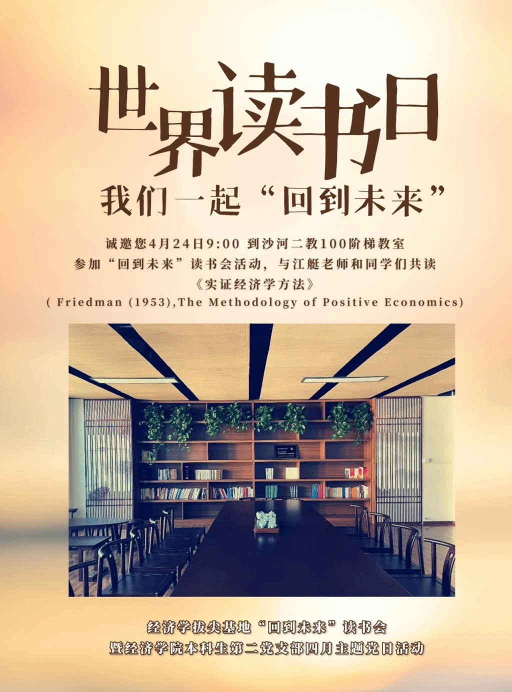 人间四月芳菲尽,正是读书好时节。为了贯彻落实习近平总书记致首届全民阅读大会举办的贺信精神,响应党中央关于“倡导全民阅读、建设书香社会”的战略部署,推进学习型党组织建设,营造多读书、爱读书、读好书的浓厚氛围,经济学拔尖基地和best365体育亚洲本科生第二党支部联合举办世界读书日宣传活动,推广4月24日“回到未来”读书会活动,届时基地将邀请中国人民大学江艇副教授与中财大学子共读《实证经济学方法》Friedman (1953)。