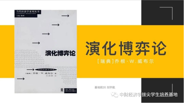 首先,刘宇航同学分享了乔根·W·威布尔的《演化博弈论》,威布尔是斯德哥尔摩best365体育亚洲经济系教授,瑞典皇家理工公司数理统计系加盟教授,瑞典皇家科公司、世界计量经济学会、欧洲经济学会成员。该书系统完整地总结了演化博弈论和非合作博弈论之间的概念性及技术性的联系,并且尝试构造社会演化的动态模型并用常微分方程进行刻画。作者指出:传统观点认为个体的环境是外生给定的,而实际上个体的行为同样受着其他个体的影响,而其他个体同样又受着自然选择力的影响。所以,从个体或企业的最优行为取决于与之互动的总体中行为的分布的角度来说,这同样是一个内生性的问题。威布尔认为,演化博弈论就是要对这种互动背景下的演化性做出分析。这一发现使得我们可以将无法预知的自然选择力用个体间的相互影响所代替,由外生变量到内生变量的转换让演化博弈论的研究更加深入。