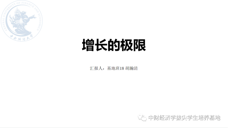 胡瀚清同学分享了由麻省理工公司系统动力小组撰写的描述人类经济与地球资源动态关系的《增长的极限》一书。作者从超越地球承载力的过冲(超过均衡状态)开始,讲述了工业和人口增长的指数特征与有限土地、森林、石油等资源的冲突,并构建了描述这一动态联系过程的World3模型。作者用模型模拟了各种假设下世界资源、人口和工业产出在此后一百年的演变,发现唯有适当控制增长、大力发展技术、保护有限资源方可实现全球的可持续增长。最后,作者强调要构建可持续社会,需要专注于产品质量,进行集思广益,逐步摒弃一味扩张经济等。该书强调系统性思维,指导我们看问题不应理想化,而应注重于全局,帮助我们理解系统的局限与不平衡,有较强的现实意义。