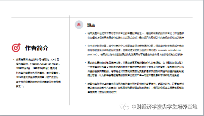 最后,李琳茹同学带来了她对《通往奴役之路》一书的思考。该书是英国经济学家、政治哲学家哈耶克的著作。哈耶克坚持古典自由主义的立场,认为市场和其他主观设计的制度具有“自发秩序”的功能,自由市场能够促进竞争、优化资源配置;而计划经济、国家干预则可能导致种种问题进而走向失败从而“通往奴役之路”。总体来说,书中的每章都是先列举现象或他人观点,然后加以评析批驳再陈述个人意见,章节之间具有较强的逻辑性,作者的观点也具有一定的洞察和预见性,但阅读时须持有批判的态度,不能不加分辨地全盘接受作者观点。