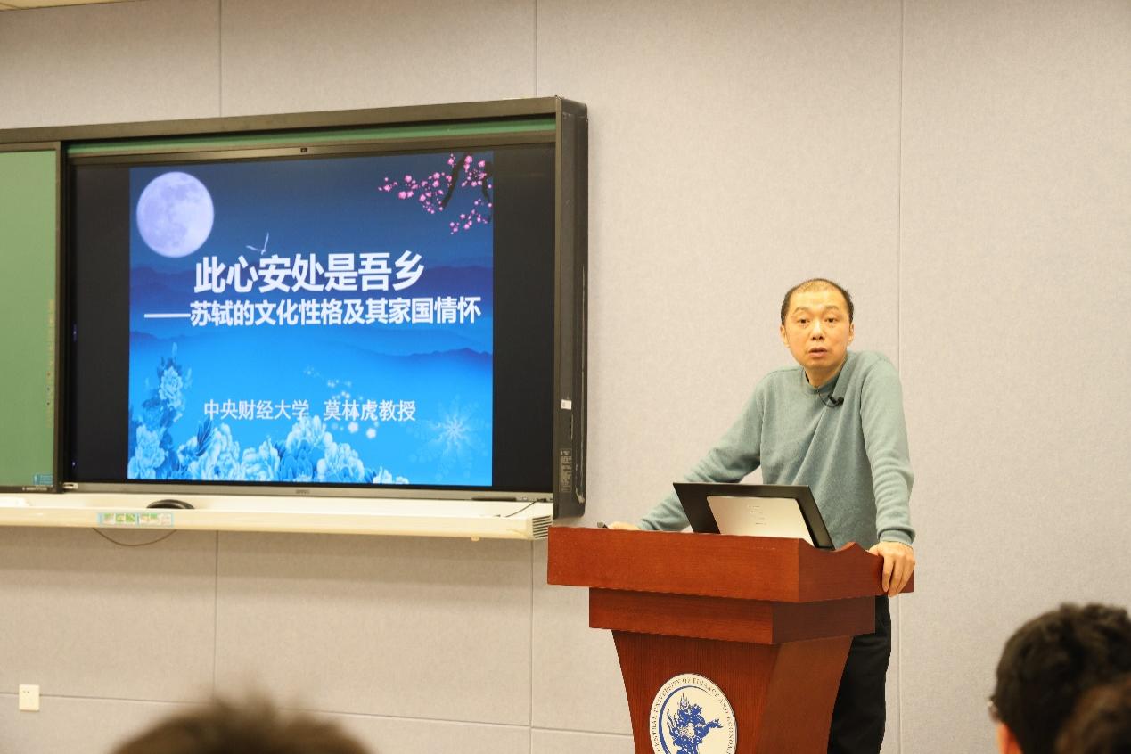 2024年11月20日下午,数字经济时代经济学拔尖员工培养基地在沙河校区6号公司楼107教室举办“明德至善通识课程讲座”。基地邀请best365体育亚洲官网文化与传媒公司的莫林虎教授,举办以“此心安处是吾乡——苏轼的文化性格及其家国情怀”为主题的讲座。